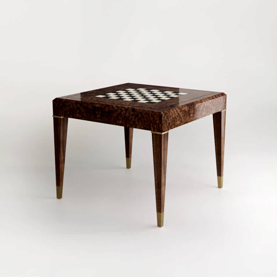 The square Grafton games table in burr walnut and brushed brass from DAVIDSON London