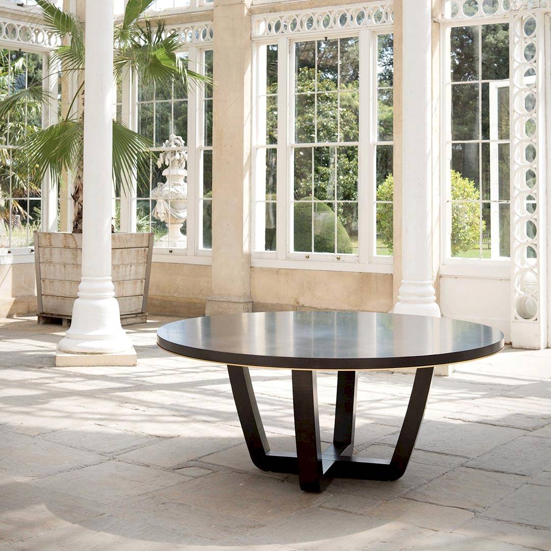 The circular top is supported by cruciform sled legs designed with tempered angles for a gentle yet modern look, with a smart metal trim that sits flush to the frieze. There is the option of a central turntable which brings ease and comfort to your dining experience by putting everything within reach, while simultaneously adding an interesting design detail to the table.