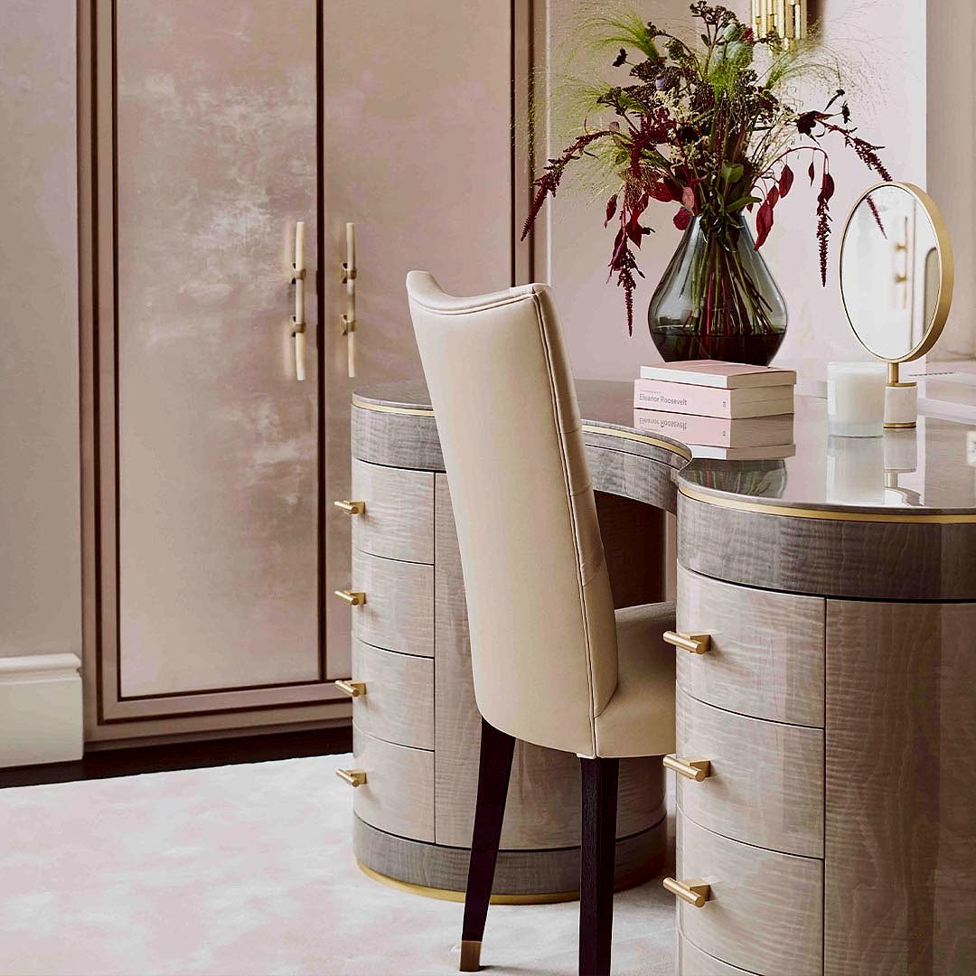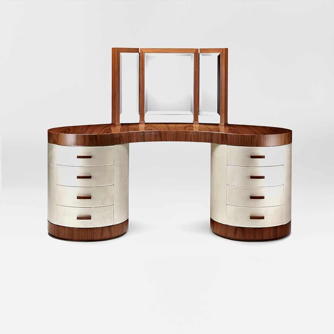 Fulfilling practical as well as aesthetic requirements, the Chrysler’s ample storage consists of a central compartmentalised drawer for storing jewellery or other boudoir essentials. Then, on each side, are four drawers on soft-close runners for impeccable functionality. The interior of the drawers are lined in satin wood to match the exterior finish.