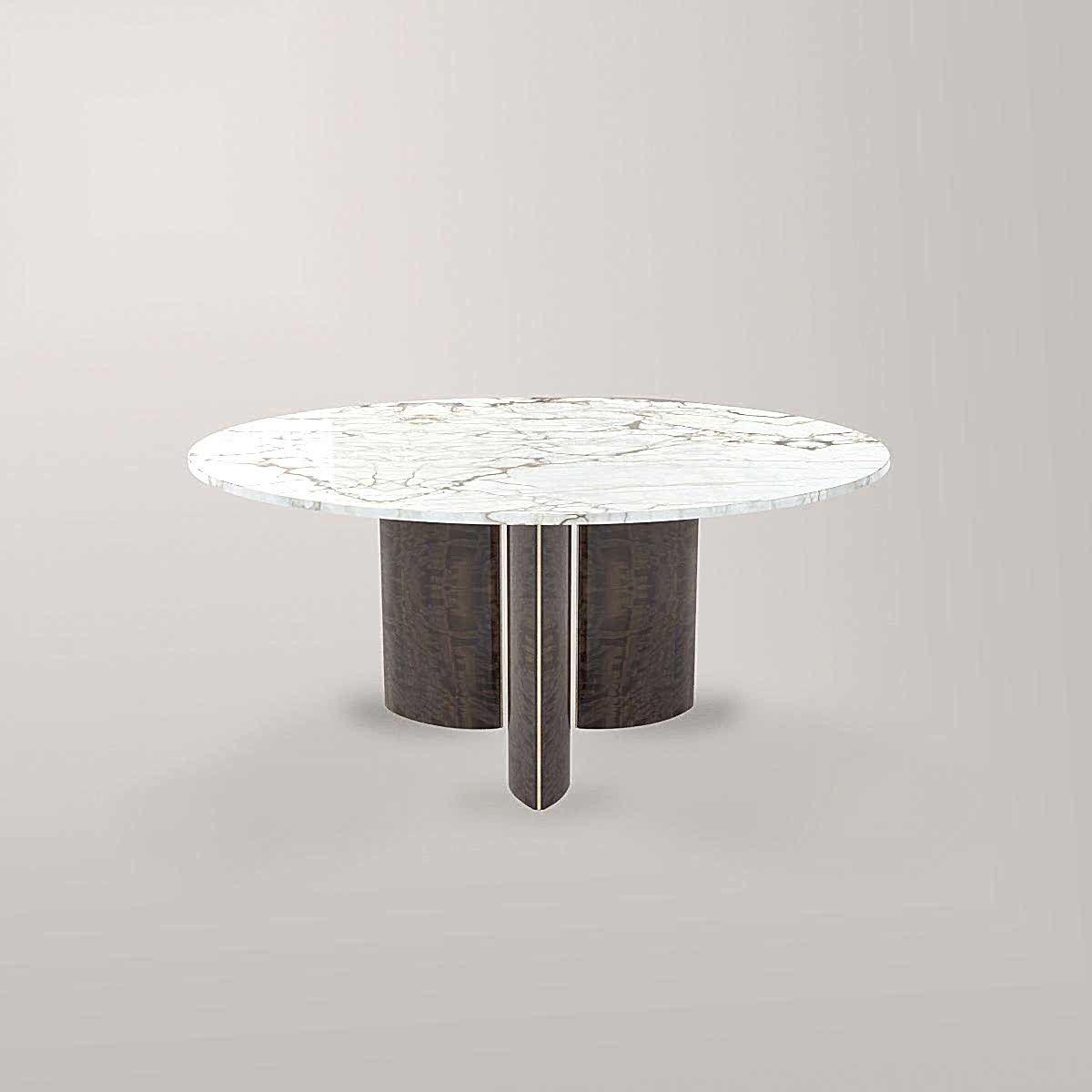 Perfectly proportioned for more intimate dining, the circular design promotes connection and conversation, while the statement marble top ensures each table is truly one of a kind. The pedestal base, expertly finished in brown eucalyptus, offers both stability and sculptural appeal.
