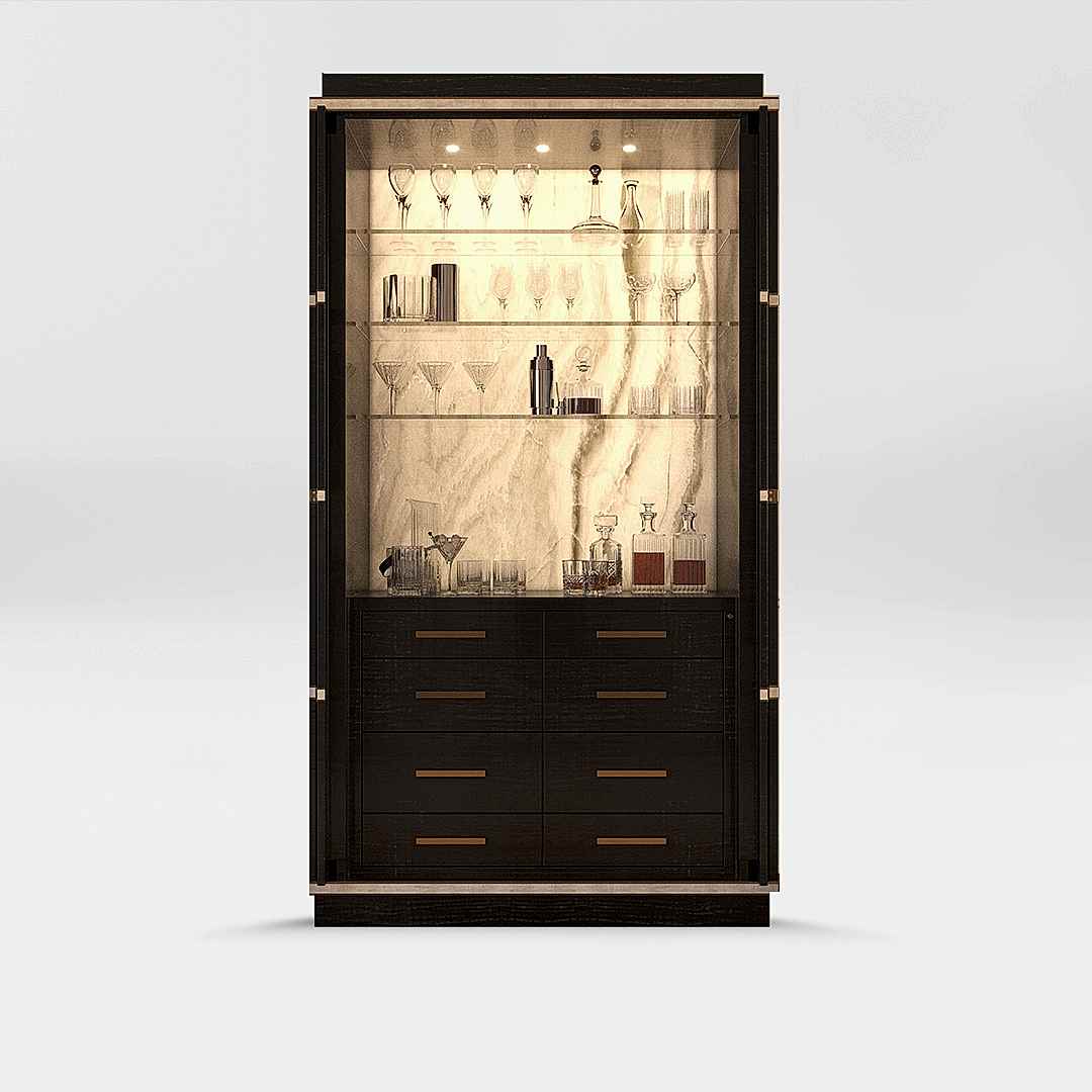 A superlative cocktail cabinet, the Collins has a striking onyx back bar, glass storage shelves, a black marble preparation counter and an elegant exterior of black and pearl sycamores, with brushed brass detailing.