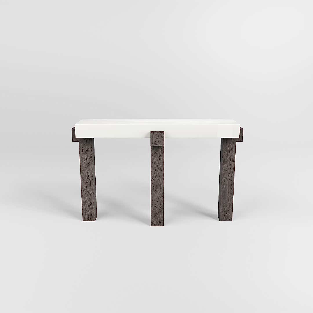 The high gloss lacquer top harmoniously contrasts with the matte finish of the ash veneer legs, creating a visually captivating piece. Place the console in a hallway, and style it with an arrangement of art, or use it as a stylish room divider behind a sofa, showcasing a curated selection of high-end decorative objects.