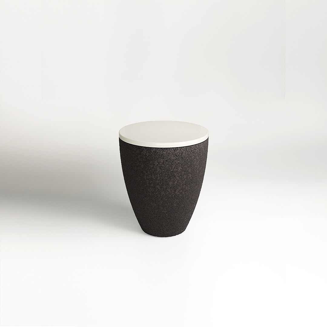 Designed with a volcanic stone base, the Drum is grounded in organic texture, creating a rich, tactile quality that enhances its architectural silhouette. Its satin lacquer top, available in a curated selection of hues, provides a sleek, luminous surface that reflects DAVIDSON London’s commitment to contemporary luxury. Pictured in Scoria, a deep, earthy tone, this piece embodies understated elegance.
