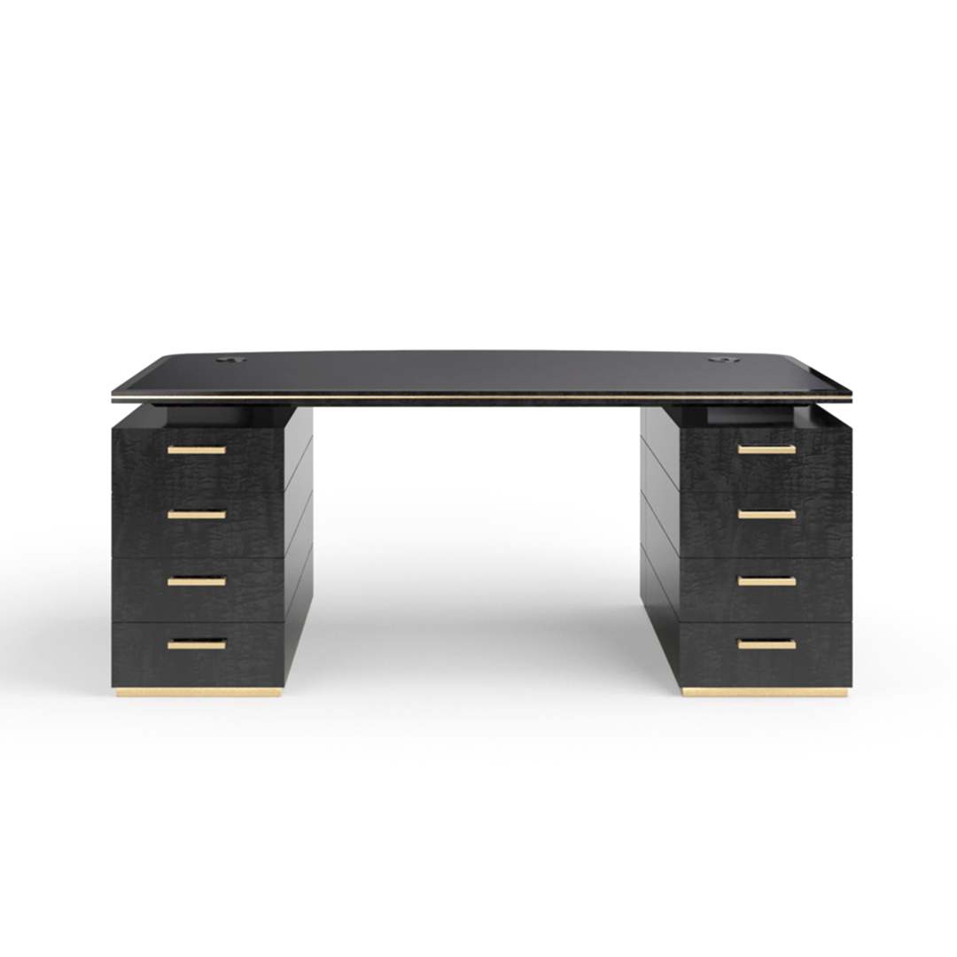 From the front, the desk features a smart curve to the tabletop and pedestal, evoking the streamlining aspect of 1930s Art Deco style. The back of the desk features a bank of drawers to each pedestal that provide plenty of storage. This desk is best suits a position in the centre of the room, where it can be admired from all angles.