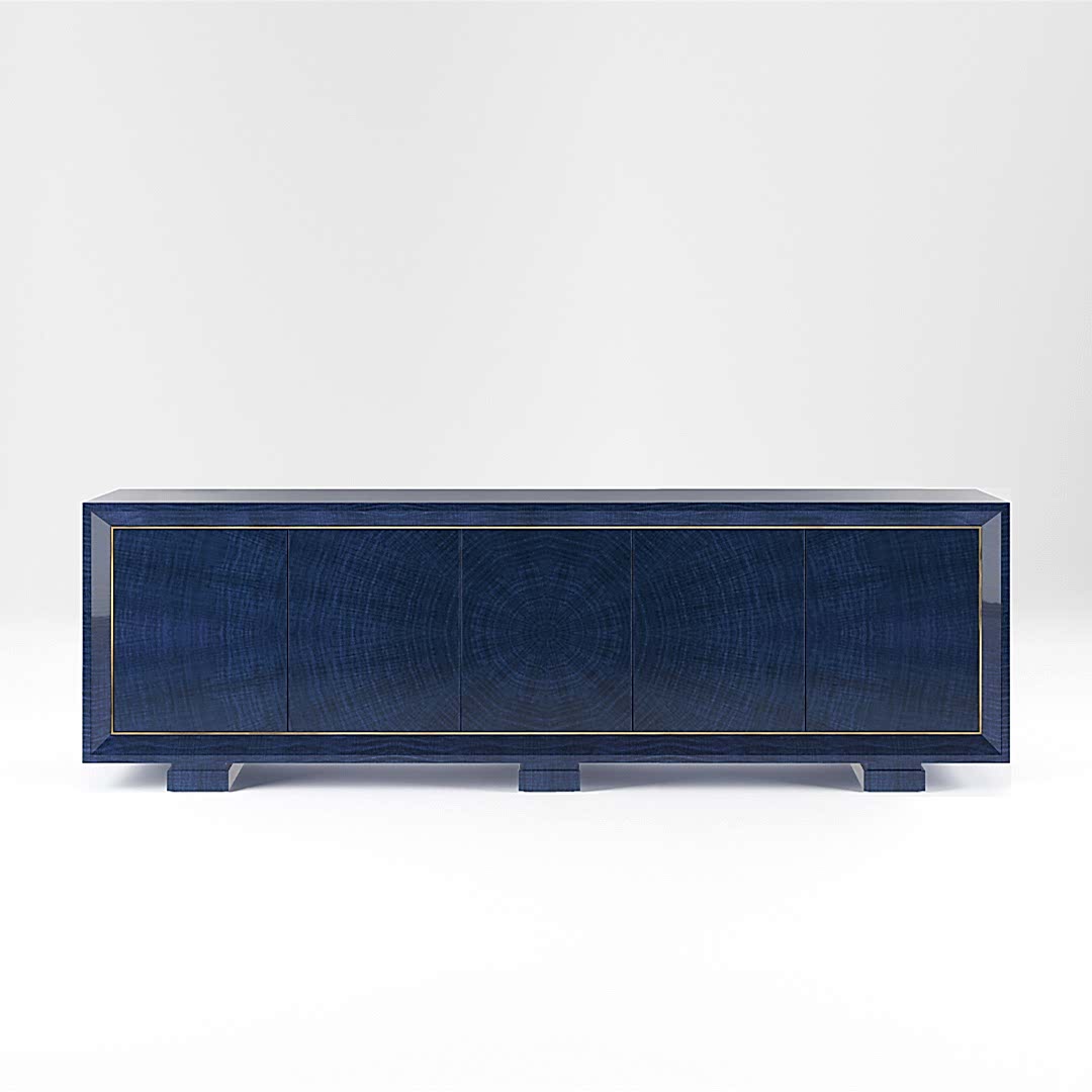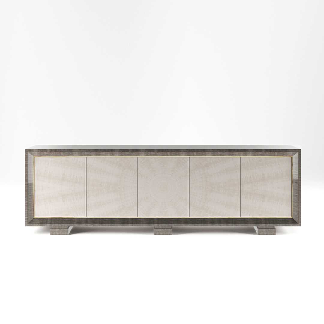 The Five Door Hillgate is an Art Deco-inspired side cabinet with lustrous finishing. It will inject glamour and style into any room. The chamfered edge gives this cabinet intrigue and character, with five doors opening to reveal a satin interior with two adjustable shelves within, and additional customisation options for further storage if required. It is smartly elevated off the ground by three plinths exuding Art Deco influence.