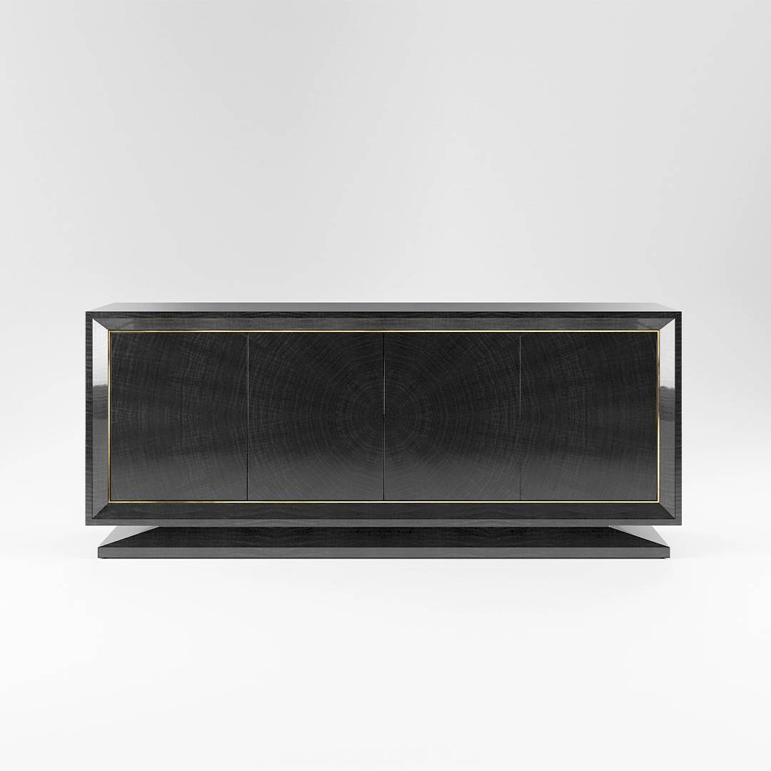 The cabinet is available in any of DAVIDSON’s gorgeous timber finishes with a stunning radial pattern, now synonymous with Davidson furniture. Shown here with four push latch doors, the cabinet boasts a metal trim for an extra touch of opulence, all standing on a well proportioned facetted base.