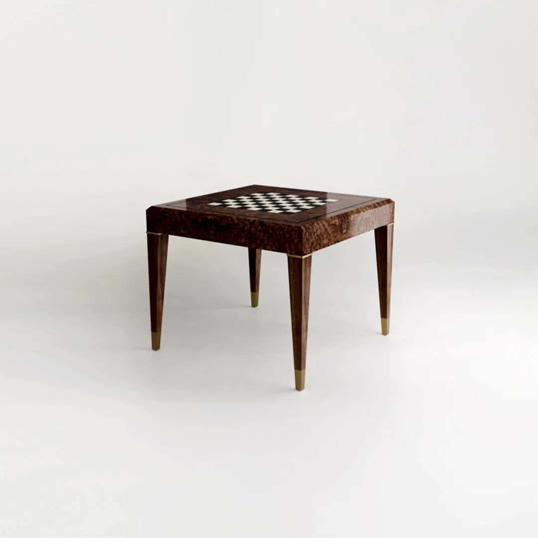 The table is composed of a square top with a central inset square, featuring an inlaid grey baize card-playing surface to one side and an inlaid chess board to the other. The top can be flipped over or removed by pressing down on one of the edges to reveal a finger groove that allows a smooth transition between games.