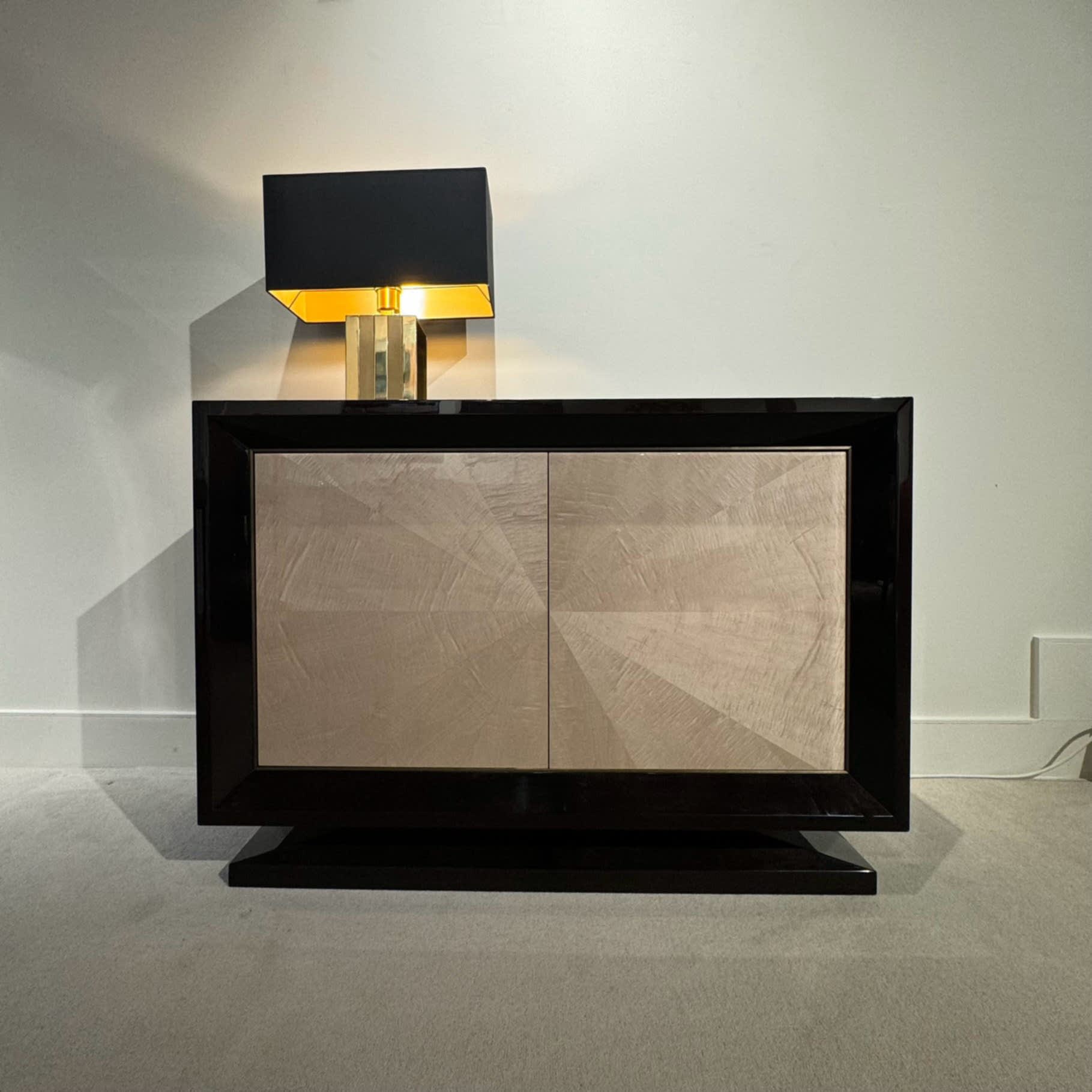 The Hanover Sideboard is a Davidson signature piece, combining classic style with modern sophistication. This two-door cabinet, shown in high-gloss Sycamore Silk with a Sycamore Black casing and brushed brass trim, enhances any room with its refined chamfered edges and superior craftsmanship. Featuring Davidson’s iconic radial veneer pattern and sleek metal trim, this sideboard sits gracefully on a facetted base, making it a true statement in luxury design.
