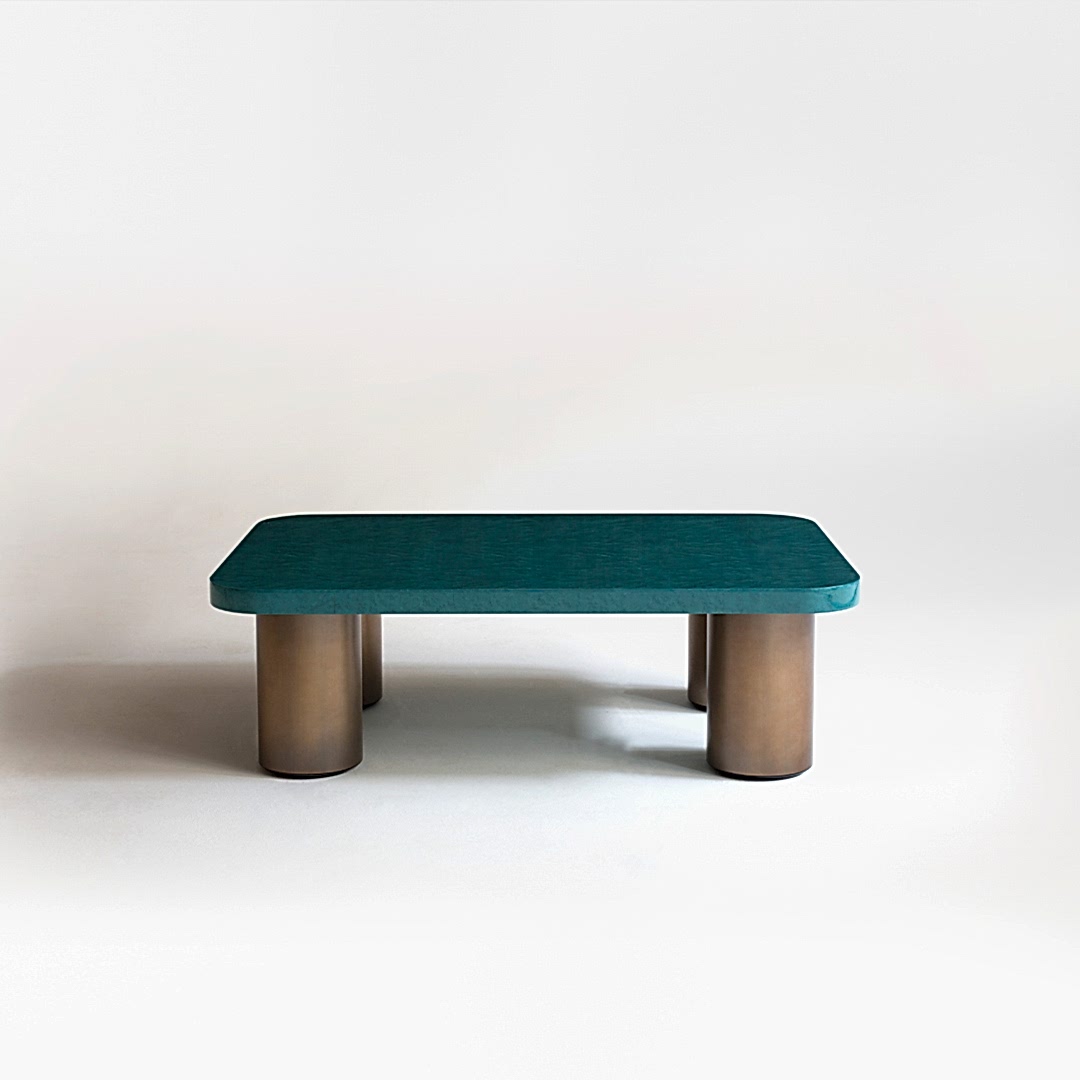 The rippling Birdseye maple tabletop tinted in a vibrant shade of turquoise echoes the bright sun-drenched colours of the West Coast. The top sits on four wide brushed antique brass legs – the perfect finishing touch to a vignette of sultry charm.