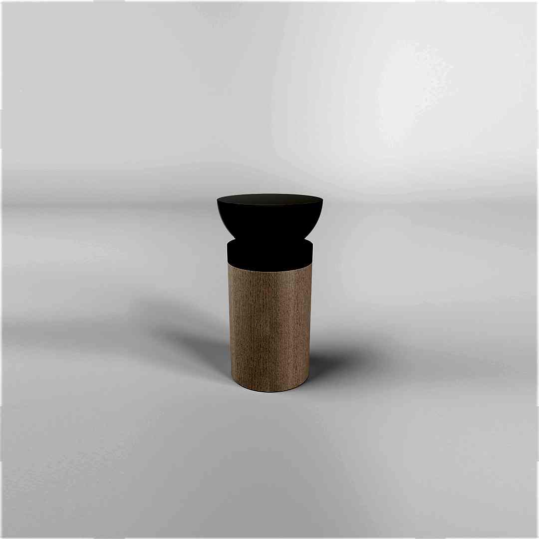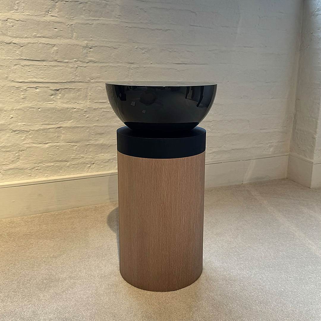 This table features a cylindrical oak base finished in satin light beige with accents of black-stained anegre, offering a subtle yet captivating contrast. The high-gloss olive green lacquered top brings a lustrous elegance to the design, while the deep ebony anegre frieze enhances its depth and sophistication.