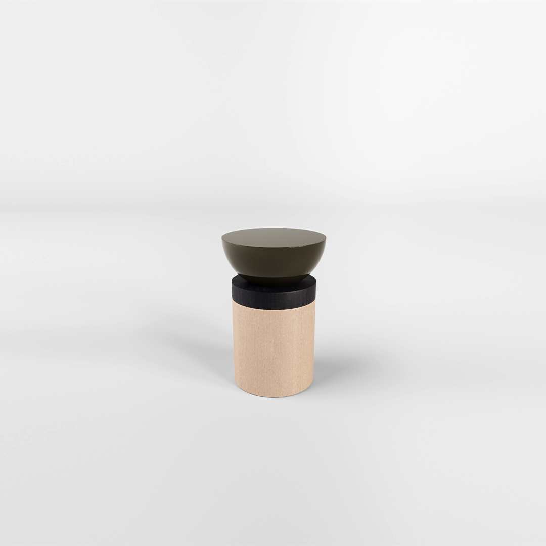 The table’s hemispherical top exudes an understated elegance that complements any refined interior. The olive green finish imparts a lustrous sheen, adding a touch of opulence to your space. The cylindrical base boasts warm, natural oak tones, accentuated by a distinctive grain pattern, ensuring each piece is truly unique.