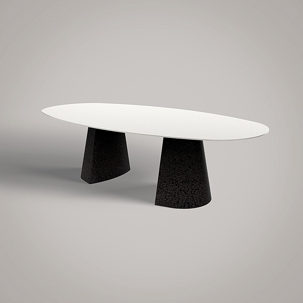 A striking blend of modern design and natural inspiration, the Obsidian Dining Table features double sculptural pedestals with a volcanic-textured finish and a sleek, ultra-thin cream lacquered top.