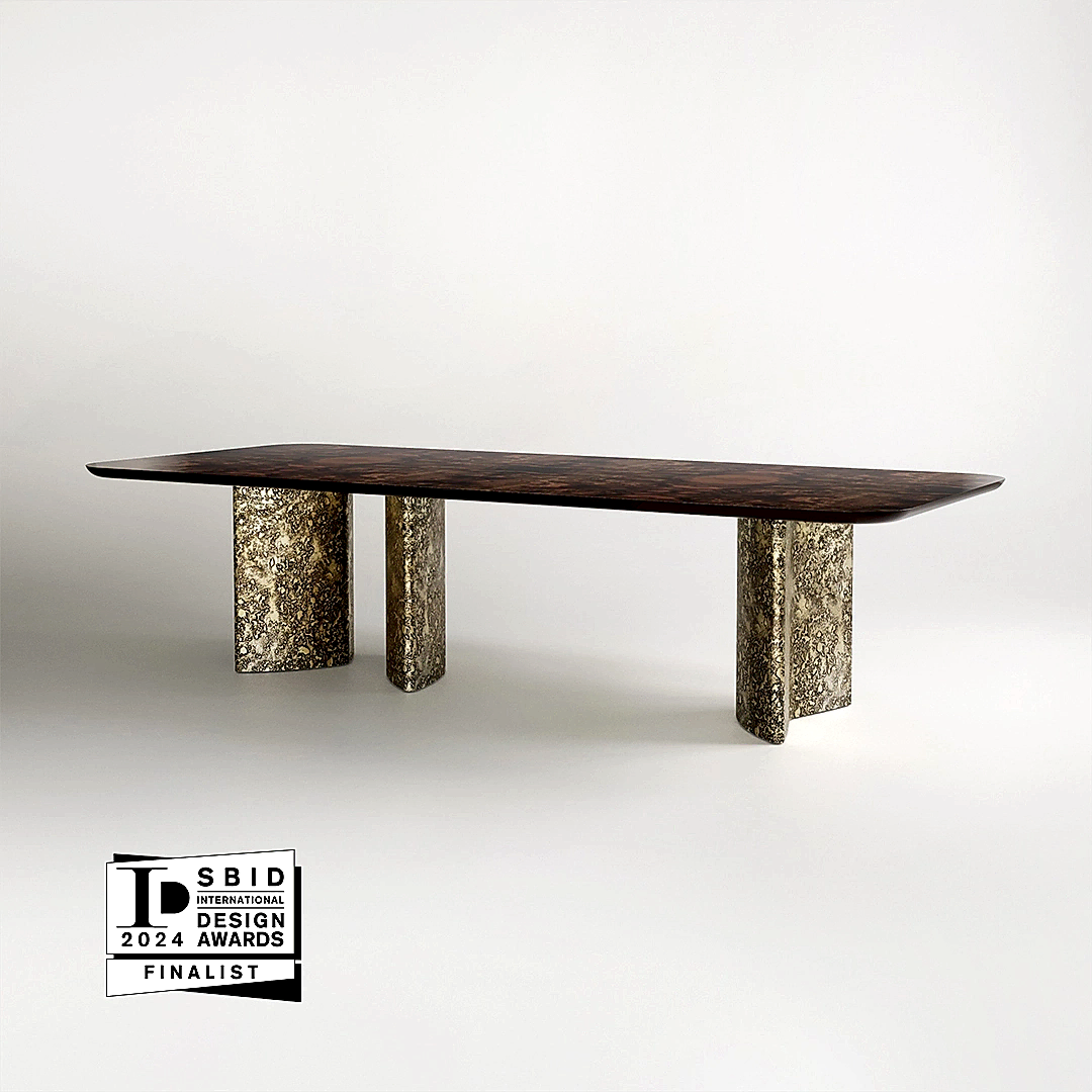 Its distinctive shaped frieze adds a touch of architectural interest, enhancing the table’s sleek profile. Supported by three sculpted pedestal bases, meticulously embellished in our innovative new bronze finish, Moon Crater, the Paris Dining Table strikes a perfect balance between style and stability. Ideal for creating a chic dining experience, this table promises to be the centrepiece of any dining room, combining timeless aesthetics with impeccable craftsmanship. Redefine your dining space with the Paris Dining Table – where luxury meets functionality in every detail.