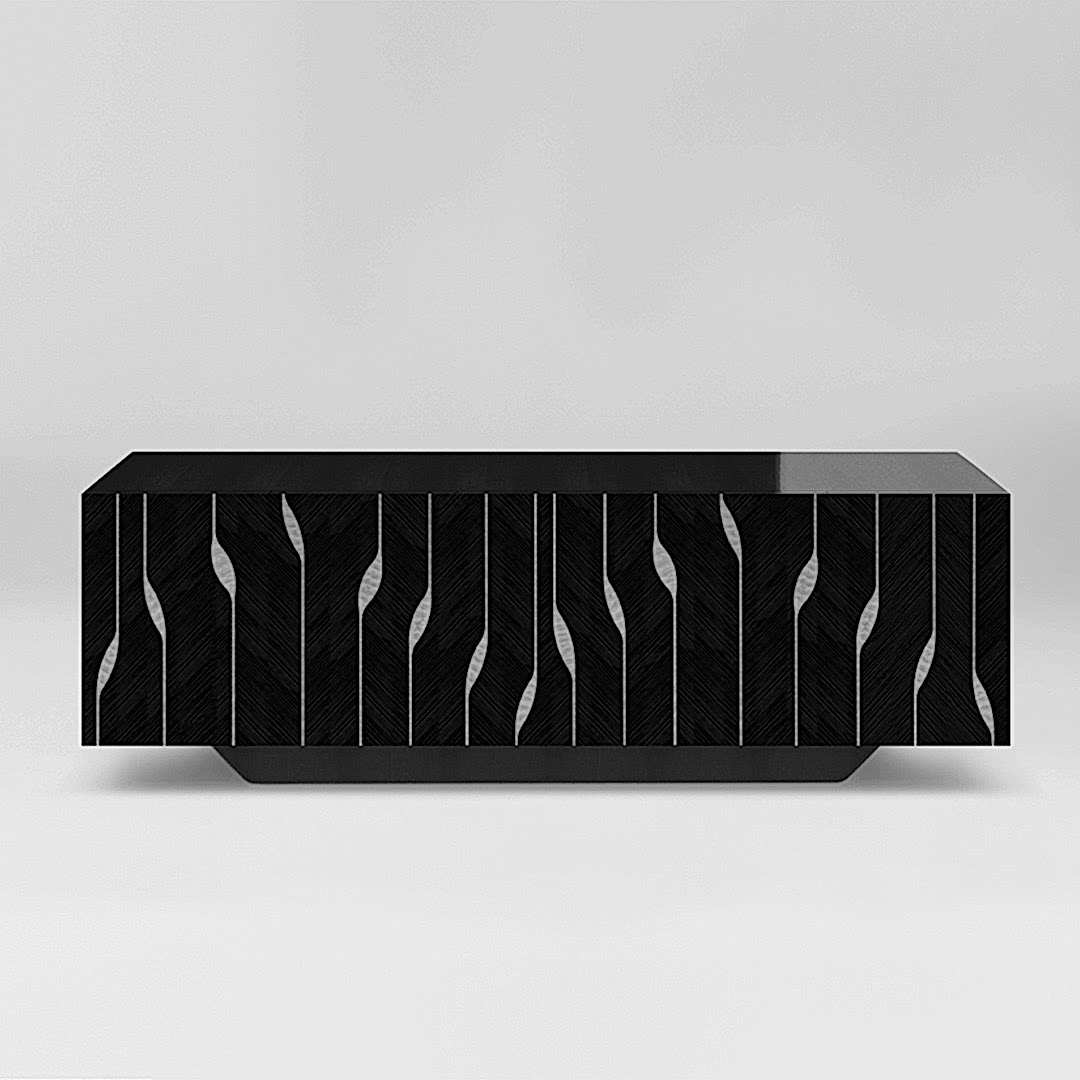 A vision of jet-black sophistication, the Regis Drinks Cabinet offers a forward-thinking interpretation of what luxury looks like in the 21st century. Defined by high gloss quilted maple in black graphite. Alongside unique marquetry in sycamore pearl. The Cabinet is the ideal addition to an interior unrivalled in elegance.