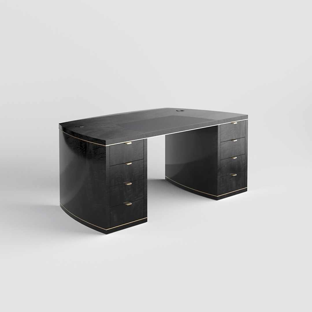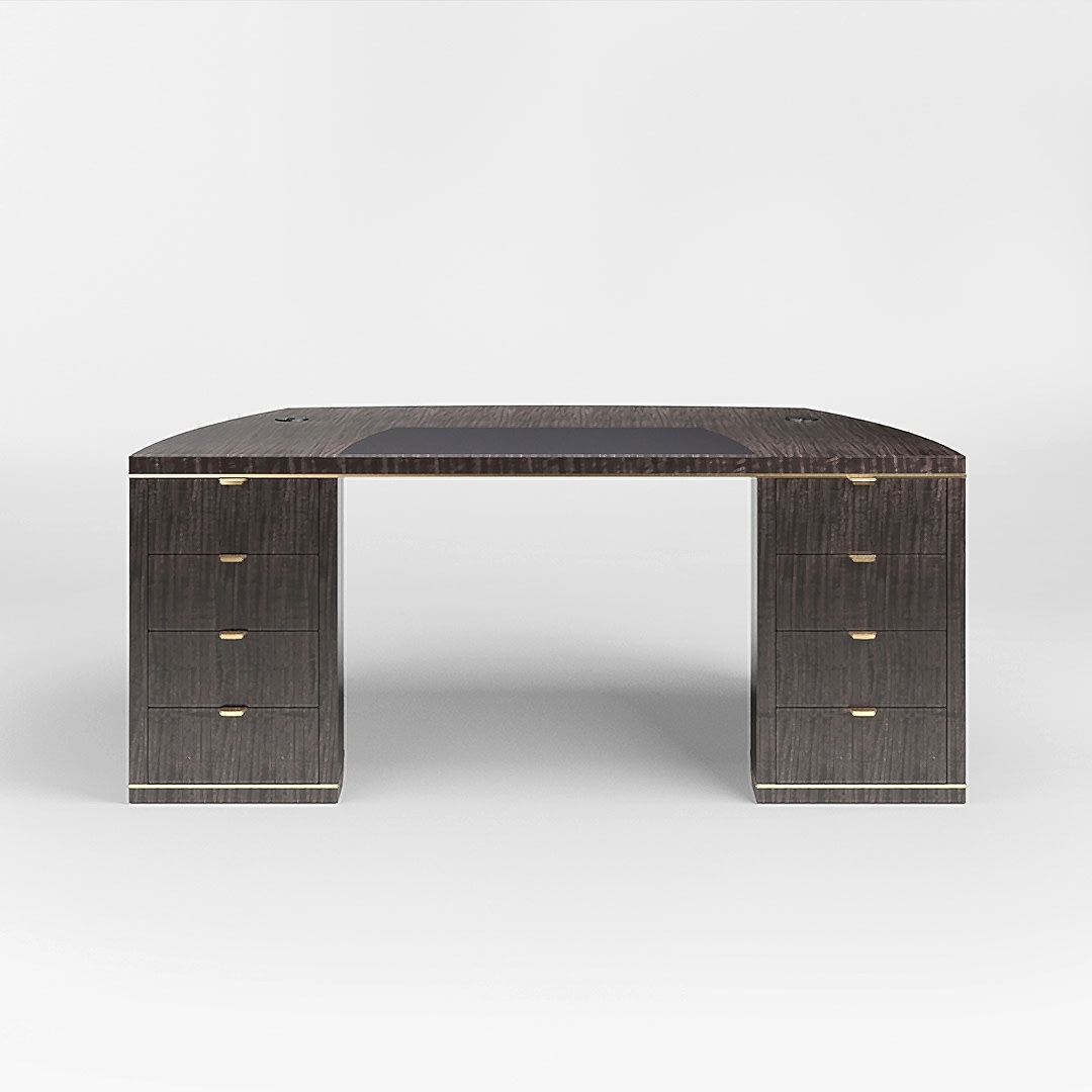 Distinctive yet elegant, the Rivington Desk has been designed with the extraordinary CEO in mind. The rich Sycamore Black finish top is contrasted with the brushed brass trim and vegan leather insert on top. The almond shaped pedestals make this a unique, executive desk destined to be the focal point of your home office, while the sliding drawers conceal fully extending soft closed runners and make your desk an ideal place to store important documents and computer accessories.