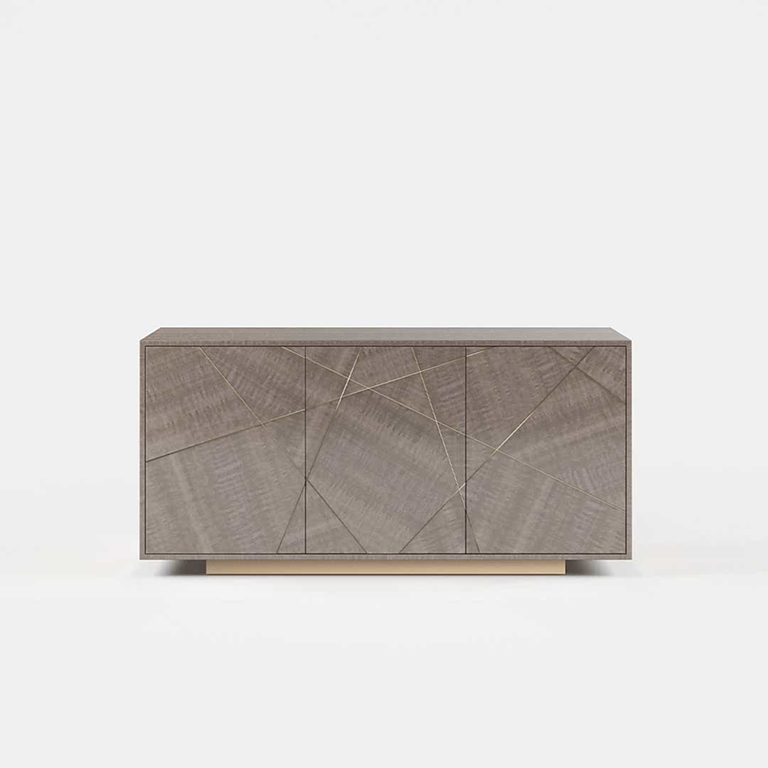 A stylish example of contemporary British craftsmanship, the three door Oblique sideboard boasts clean lines and effortless style finished in high gloss or satin timber, with a striking diagonal brushed brass design.