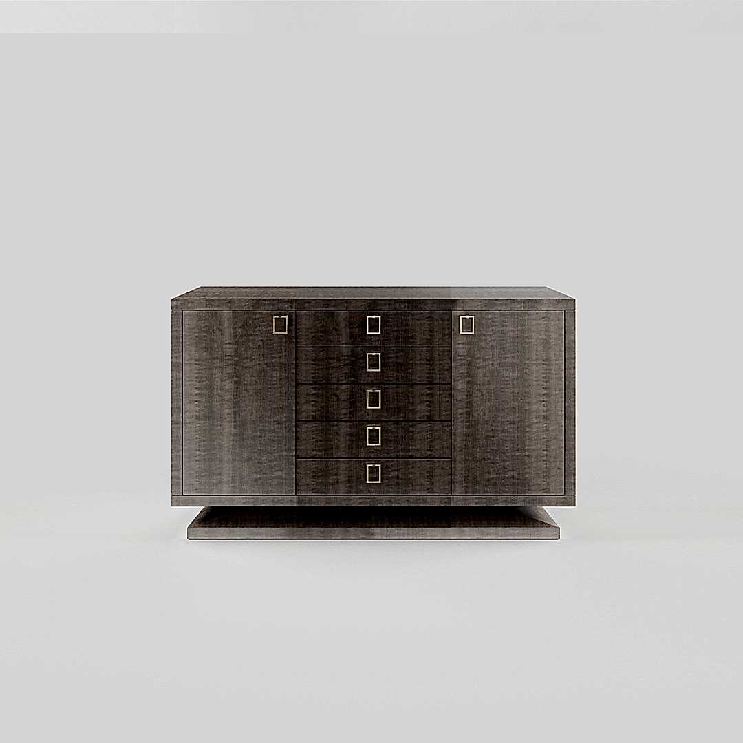 The cabinet can be finished in any of DAVIDSON’s luxury finishes with either circular or rectangular drop handles in gleaming polished nickel or brass. The central bank of drawers has the option of being flock lined with compartments for storing cutlery with a pair of doors either side that open to reveal two adjustable shelves.