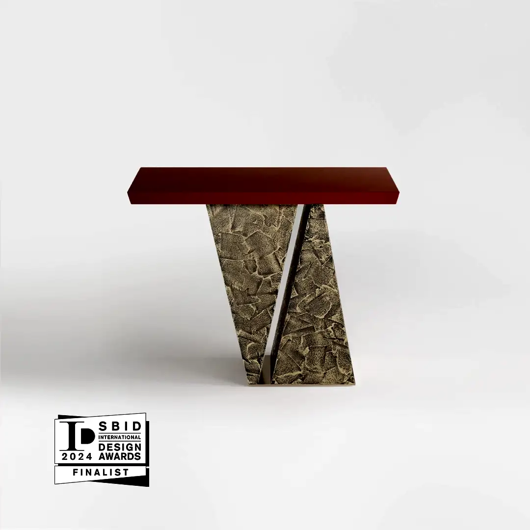 Introducing The Wedge Console Table, a modern masterpiece featuring a unique base of interlocking wedges forming a slanted rectangular shaped base. The base is finished in our new distressed bronze finish, Sand Storm, adding elegant sophistication. The table top, with its slanted edge, boasts our new lacquer finish, Moroccan Sunset, a high gloss terracotta coloured hue, offering a vibrant yet refined touch.