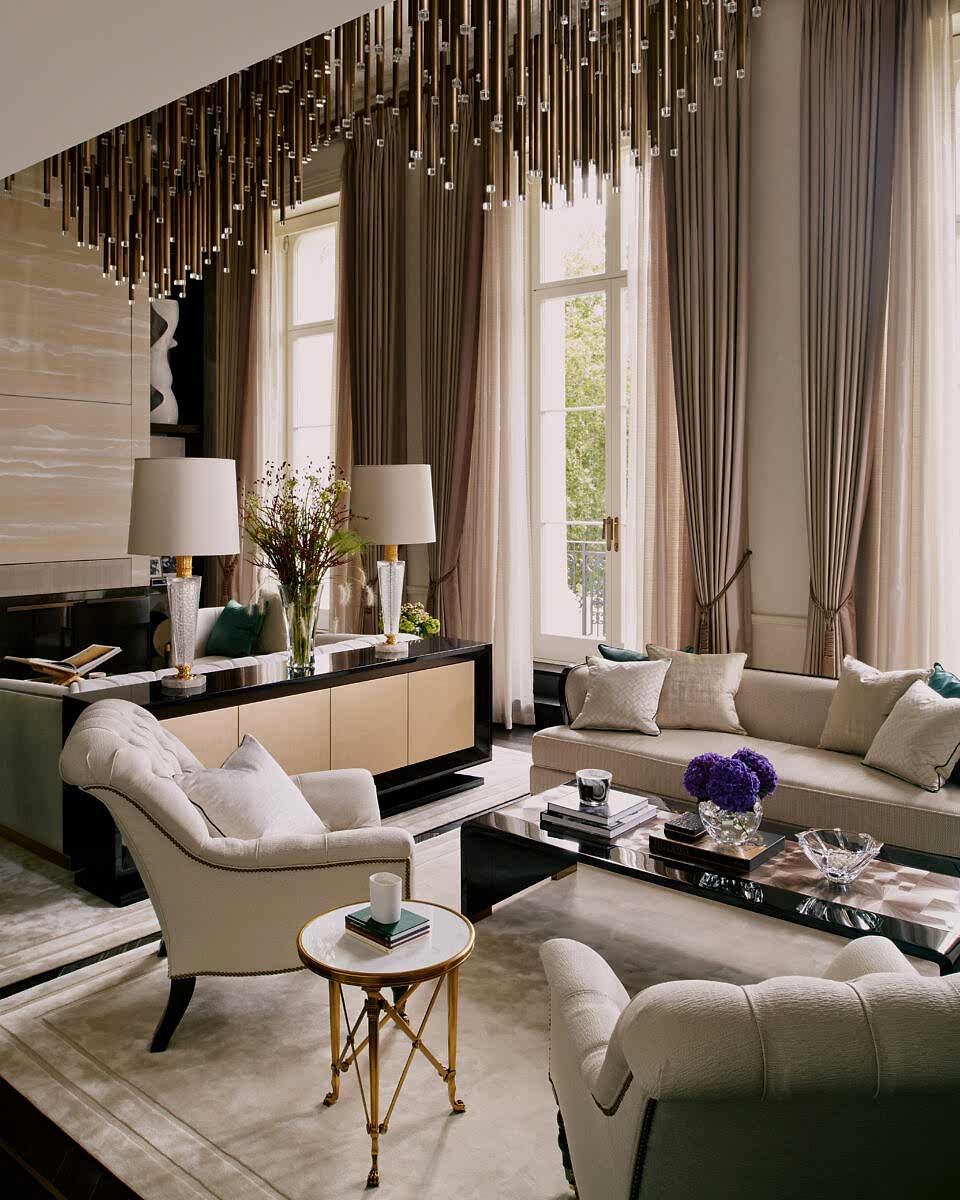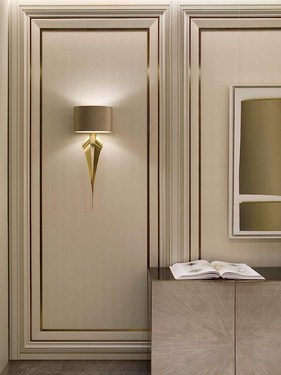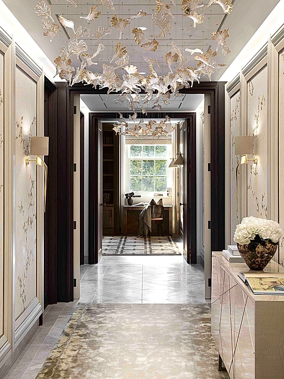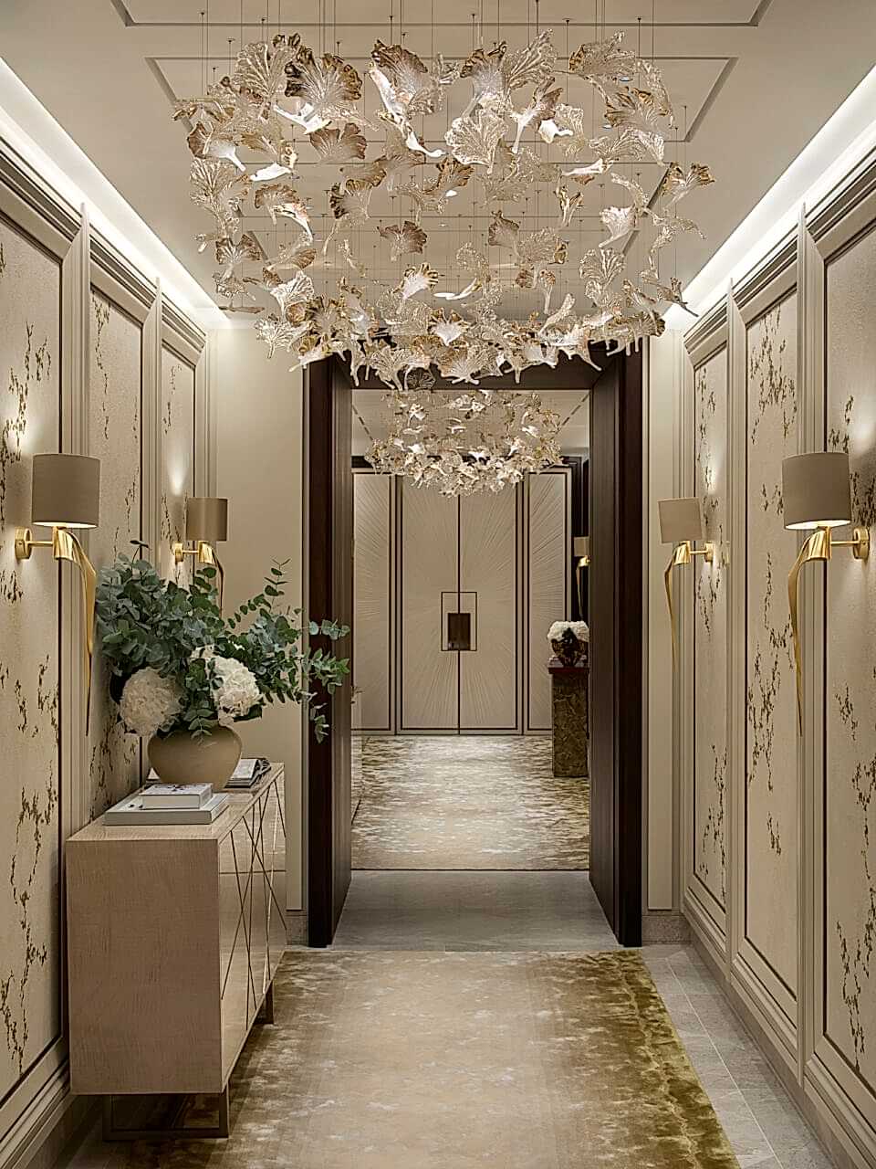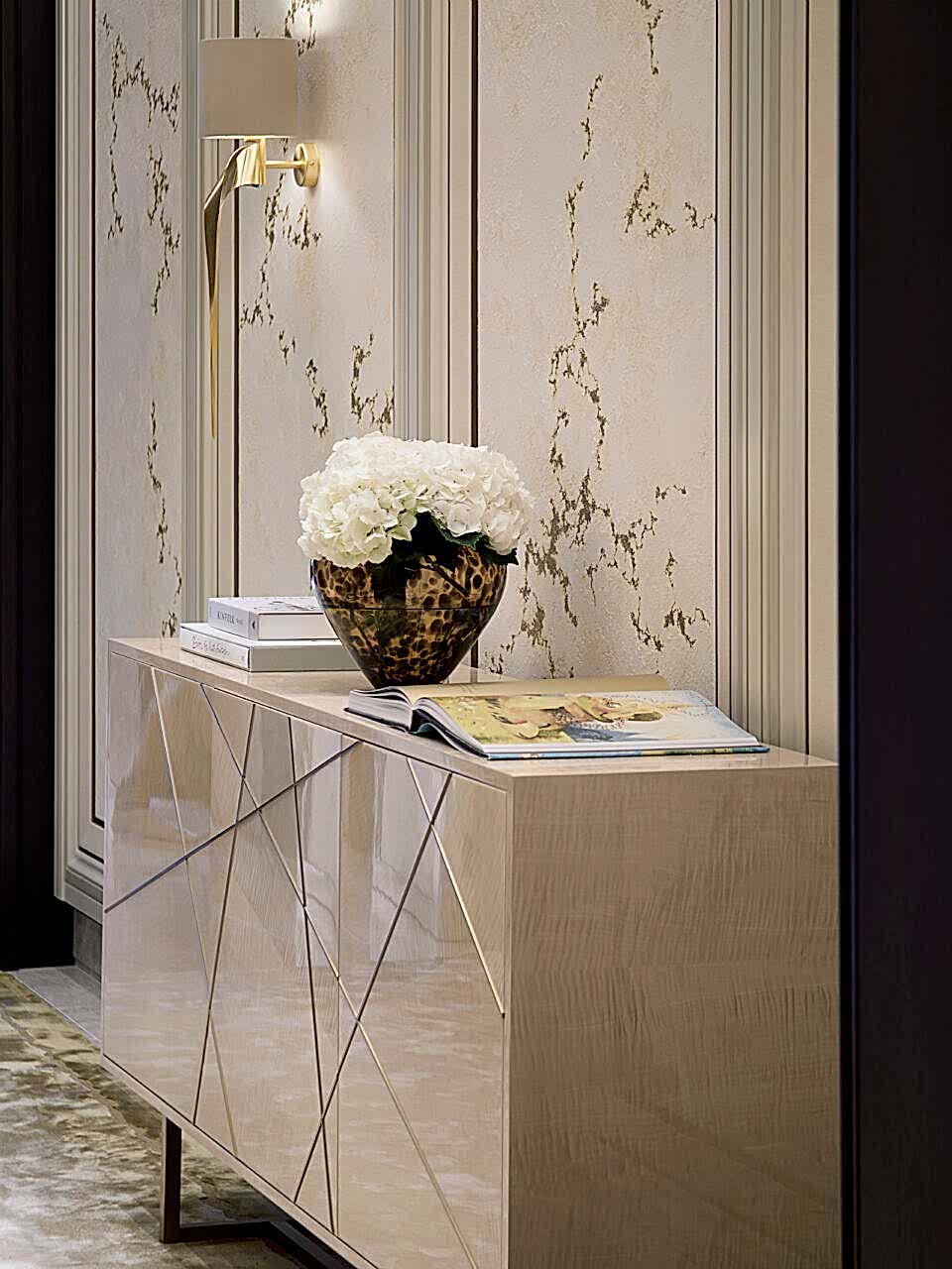 The Abstract Luxury Sideboard from Davidson London in beautiful tones of sycamore silk and polished brass in this elegant hallway designed by Celine Interiors based in Knightsbridge, London.